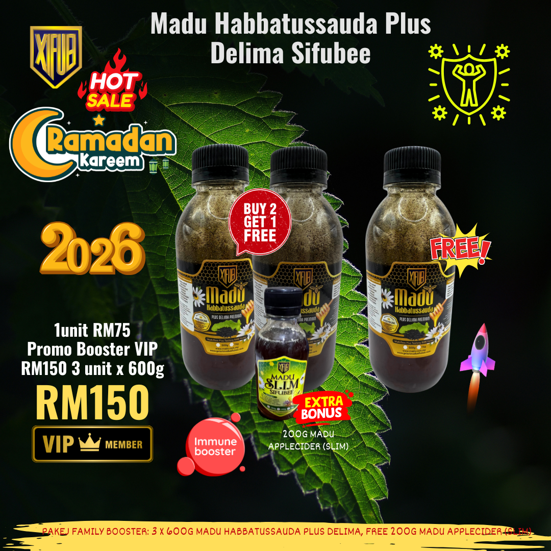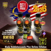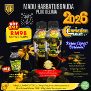 Kandungan: Madu Tualang, Madu Arab, Madu Multiflora, Minyak & Serbuk Habbatussauda, Zaitun, Za’faran, Delima, Al-Manna, Omega-3, dan Herba Pilihan berasaskan makanan.